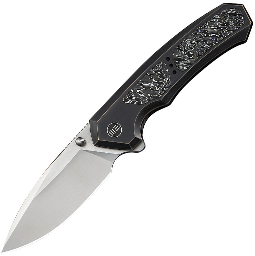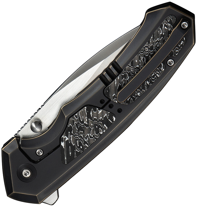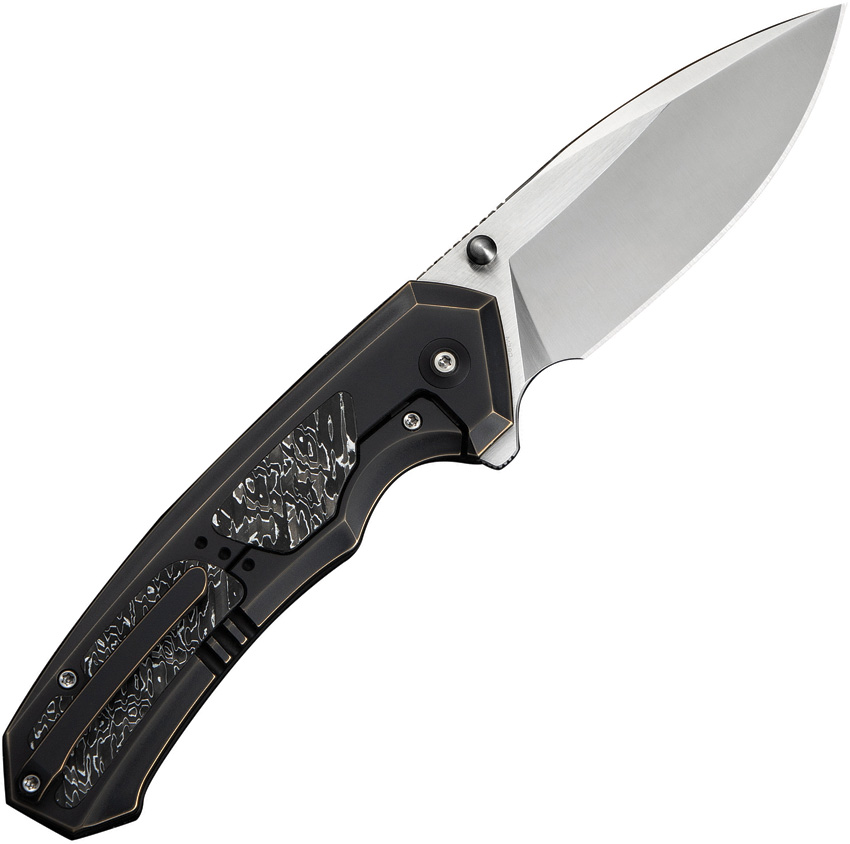 5.25″ (13.34cm) closed. 3.75″ (9.53cm) satin finish Bohler M390 stainless drop point blade. Black and bronze titanium handle with Aluminum foil carbon fiber inlay. Extended tang. Thumb stud. Pocket clip. Black nylon zippered storage case. Boxed.