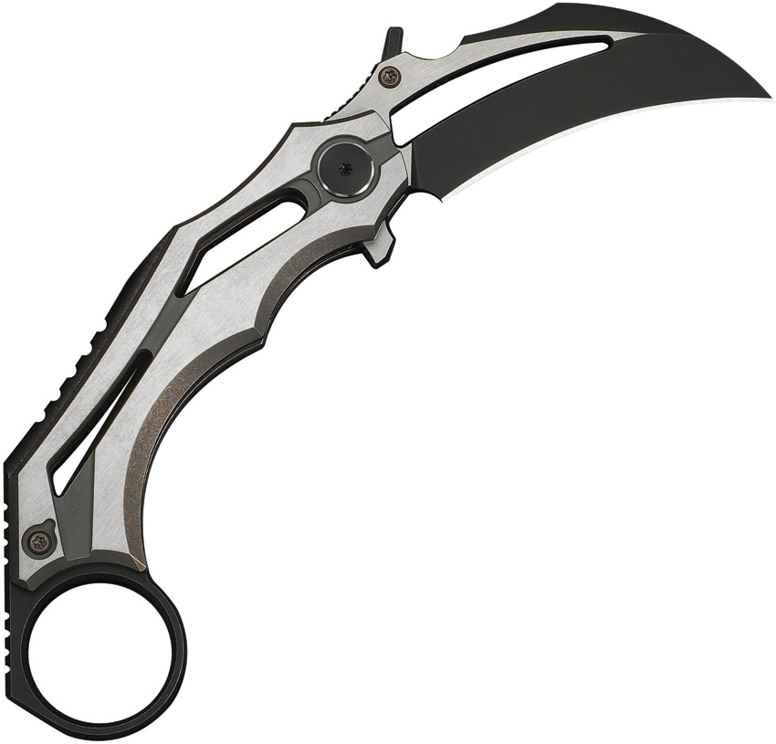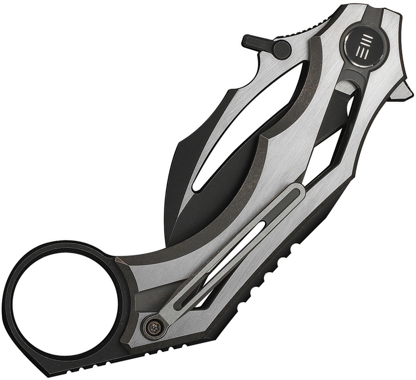 4.63″ (11.76cm) closed. 2″ (5.08cm) black stonewash and satin finish Bohler M390 stainless hawkbill blade. Bronze and satin titanium handle. Extended tang. Finger ring. Thumb disk. Pocket clip. Black nylon zippered storage case. Boxed.