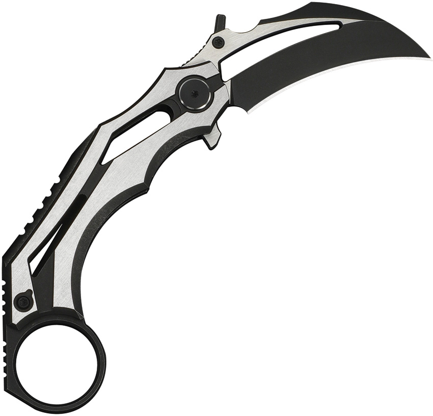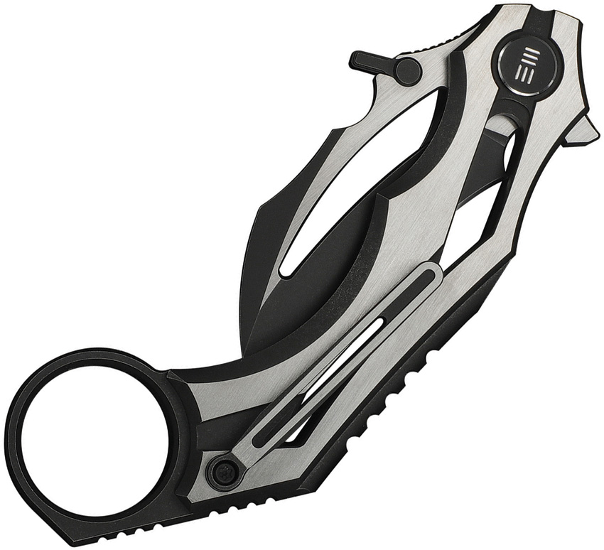 4.63″ (11.76cm) closed. 2″ (5.08cm) black stonewash and satin finish Bohler M390 stainless hawkbill blade. Black and satin titanium handle. Extended tang. Finger ring. Thumb disk. Pocket clip. Black nylon zippered storage case. Boxed.