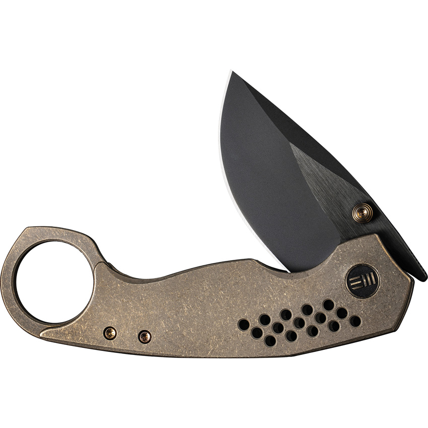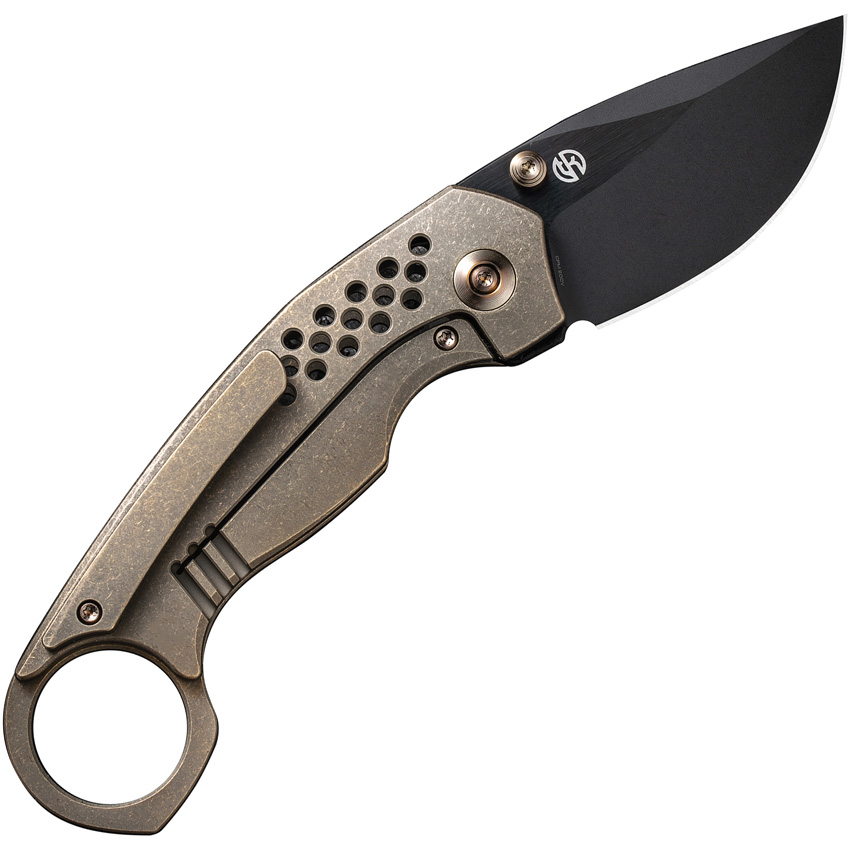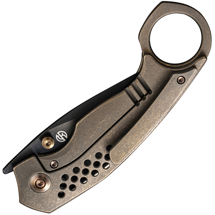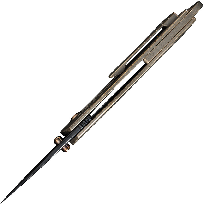 4.88″ (12.4cm) closed. 2.38″ (6.05cm) black stonewash finish CPM-20CV stainless drop point blade. Bronze stonewash finish titanium handle. Extended tang. Finger ring. Thumb stud. Pocket clip. Black nylon belt sheath. Boxed.