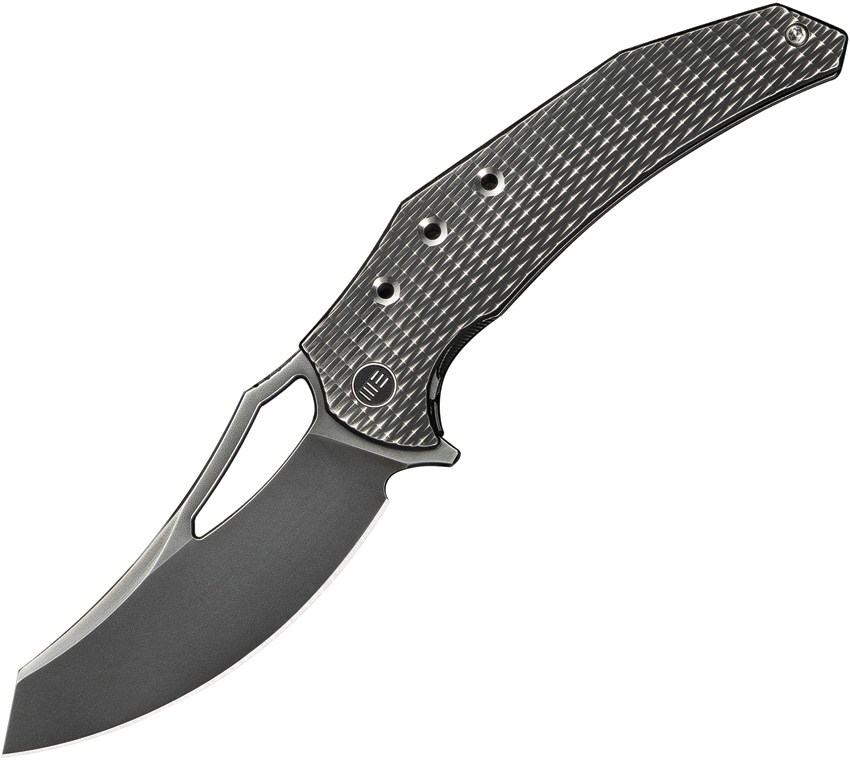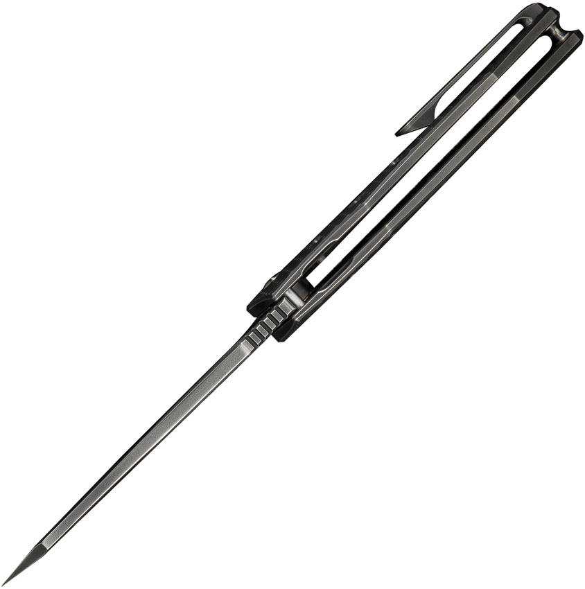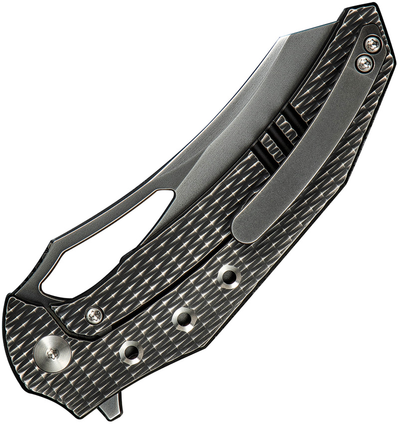 4.38″ (11.13cm) closed. 3.5″ (8.89cm) gray polished Bohler M390 stainless blade. Gray checkered titanium handle. Extended tang. Thumb pull. Pocket clip. Black Kydex belt sheath. Boxed.