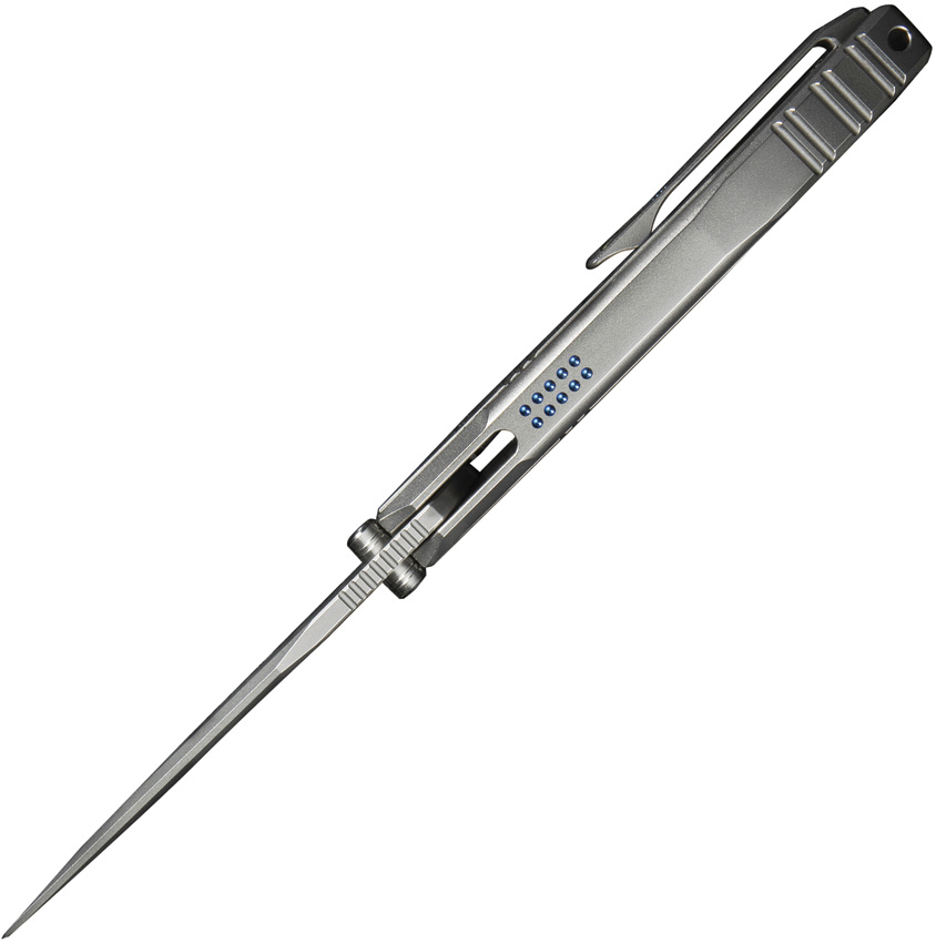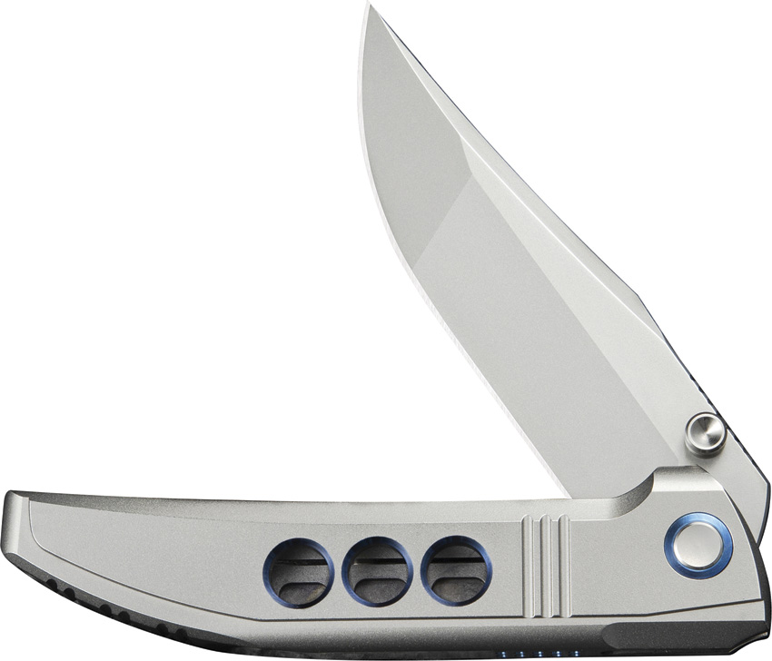 5″ (12.7cm) closed. 4″ (10.16cm) bead blast finish Bohler M390 stainless blade. Bead blast finish titanium handle. Extended tang. Thumb stud. Pocket clip. Integral handle. Black nylon zippered storage case. Boxed.
