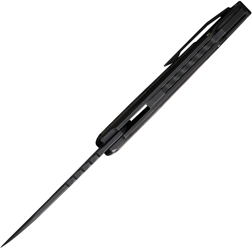 5.25″ (13.34cm) closed. 3.63″ (9.22cm) black stonewash finish CPM-20CV stainless Wharncliffe blade. Black stonewash finish titanium handle with Copper foil carbon fiber inlay. Thumb pull. Extended tang. Lanyard hole. Pocket clip. Black nylon zippered storage case. Boxed.