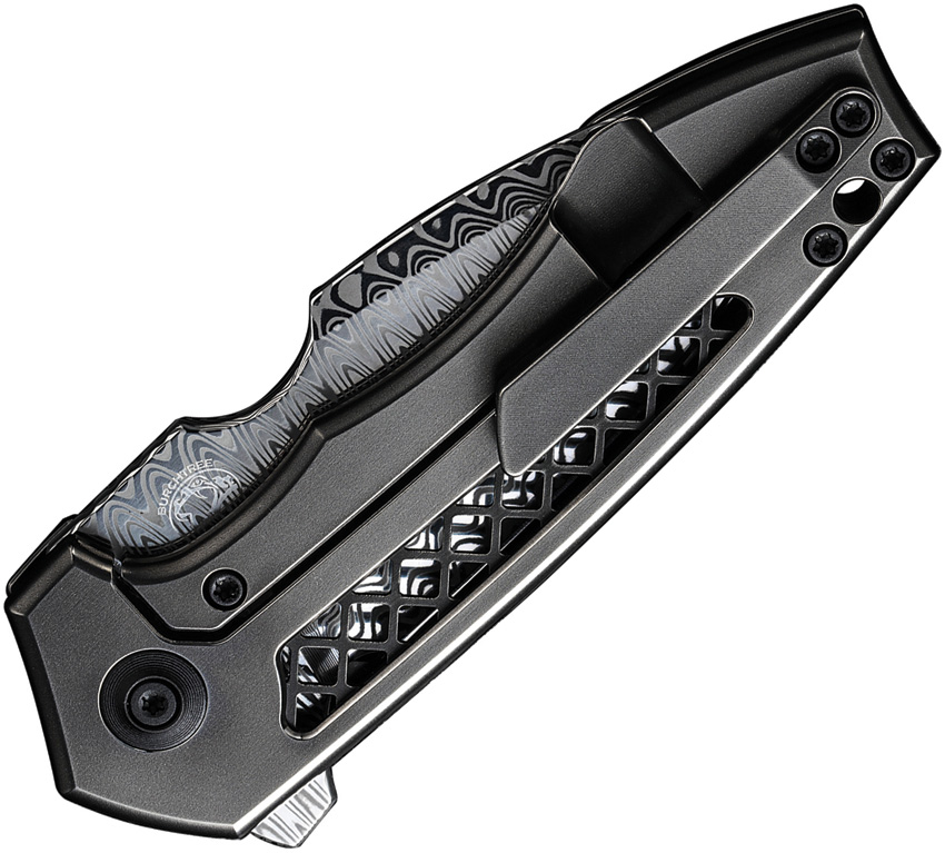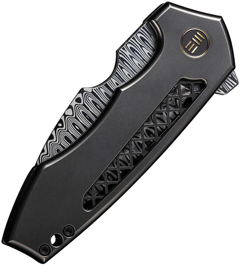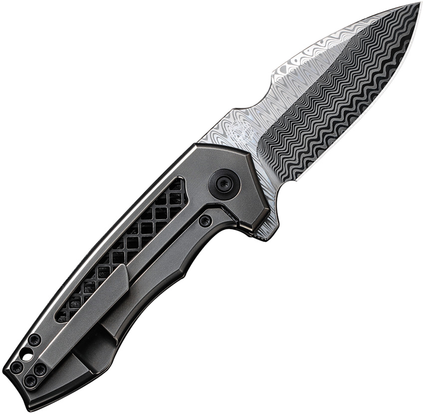 4″ (10.16cm) closed. 3″ (7.62cm) Damasteel modified drop point blade. Gray titanium handle. Extended tang. Lanyard hole. Pocket clip. Hugin blade. Black nylon zippered storage case. Boxed.