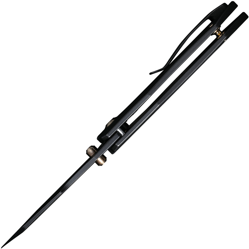 4″ (10.16cm) closed. 3″ (7.62cm) black stonewash finish CPM-20CV stainless blade. Black stonewash finish titanium handle. Thumb stud. Pocket clip. Black nylon zippered storage case. Boxed.