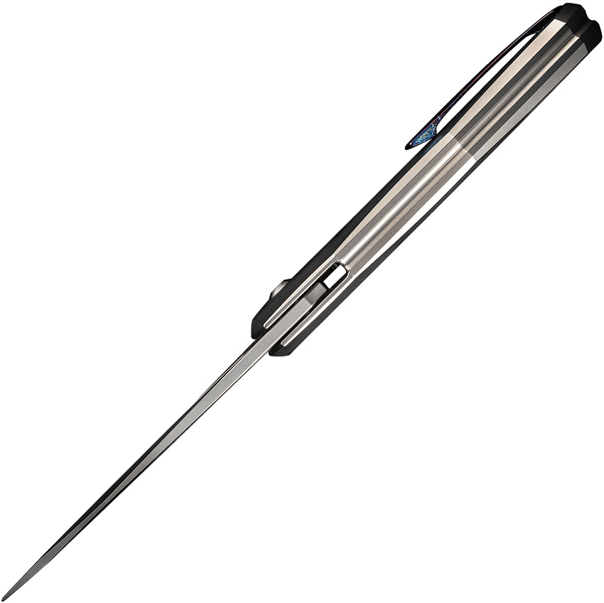 4.38″ (11.13cm) closed. 3.38″ (8.59cm) bead blast finish CPM-20CV stainless blade. Bead blast finish titanium handle. Extended tang. Thumb pull. Wharnto (Wharncliffe/tanto) blade. Timascus pocket clip. Black nylon zippered storage case. Boxed.