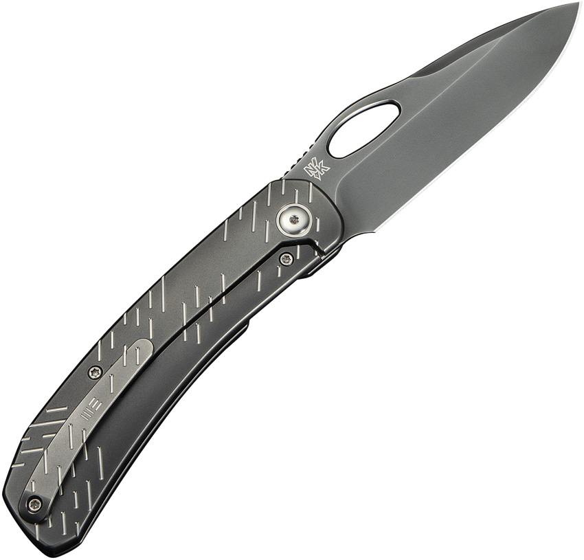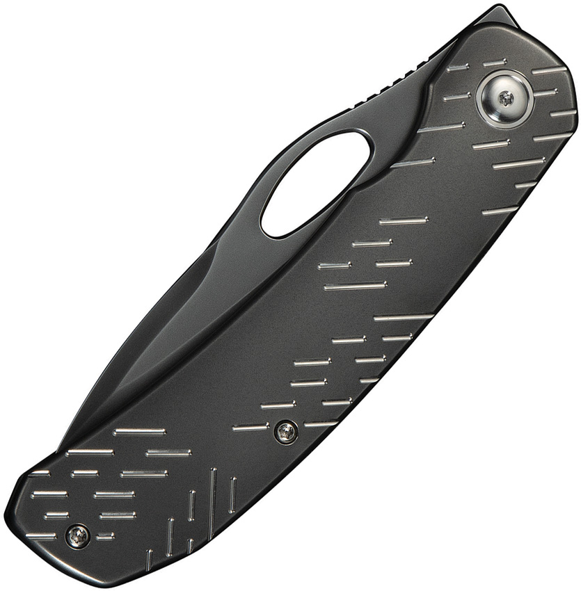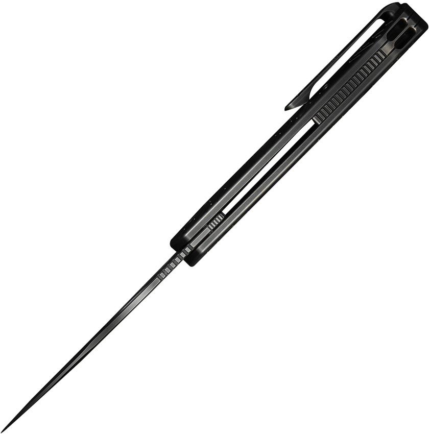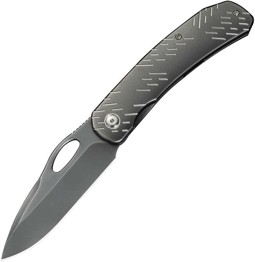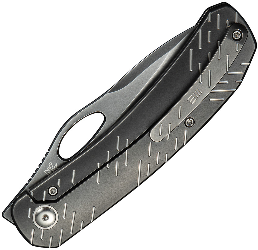 4.75″ (12.07cm) closed. 3.75″ (9.53cm) gray polished CPM-20CV stainless blade. Polished gray titanium handle. Thumb pull. Extended tang. Pocket clip. Satin raindrop pattern handle. Boxed.