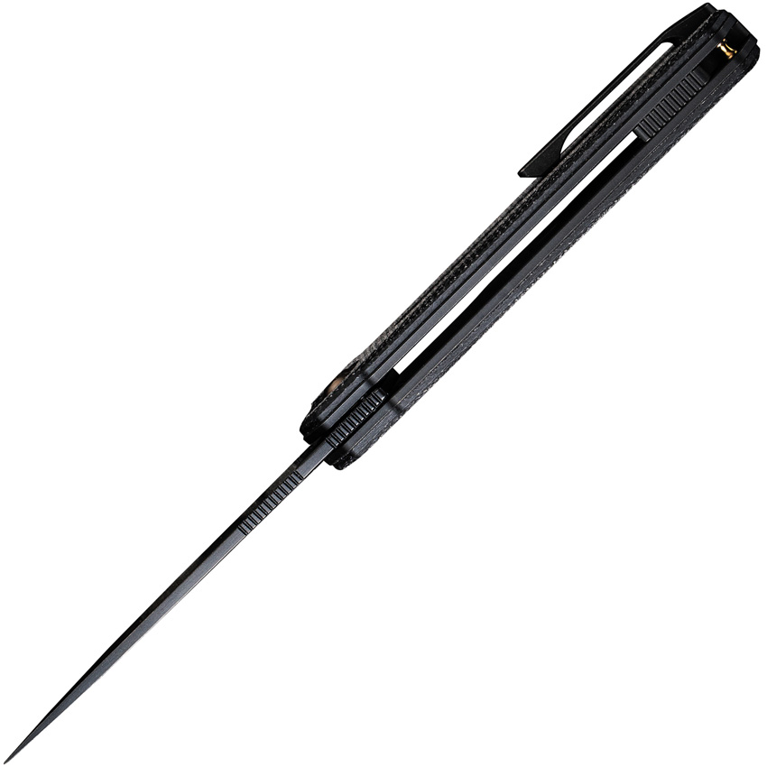 4.5″ (11.43cm) closed. 3.25″ (8.26cm) black stonewash finish CPM-20CV stainless blade. Black canvas micarta handle. Extended tang. Pocket clip. Black nylon zippered storage case. Boxed.