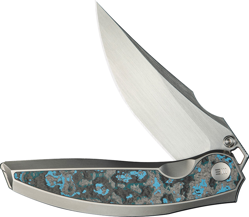 5″ (12.7cm) closed. 4″ (10.16cm) satin finish Bohler M390 stainless clip point blade. Bead blast finish titanium handle with Arctic Storm Fat carbon fiber inlay. Extended tang. Pocket clip. Thumb stud. Black nylon zippered storage case. Boxed.