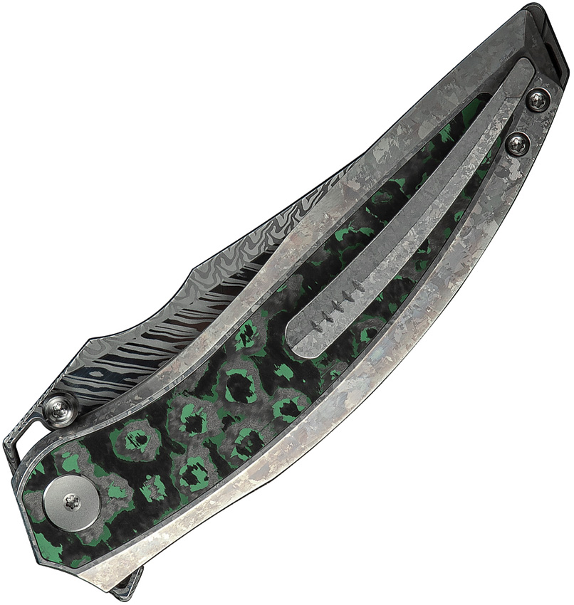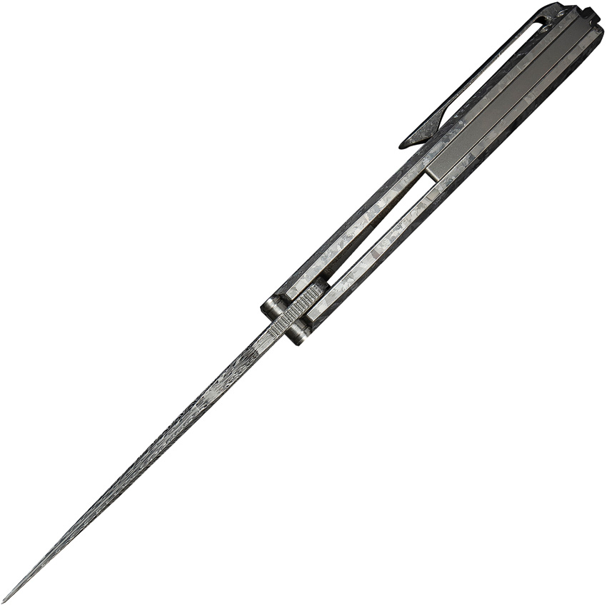5″ (12.7cm) closed. 4″ (10.16cm) Damasteel clip point blade. Crystalized silver titanium handle with Jungle Wear Fat carbon fiber inlay. Extended tang. Pocket clip. Thumb stud. Black nylon zippered storage case. Boxed.