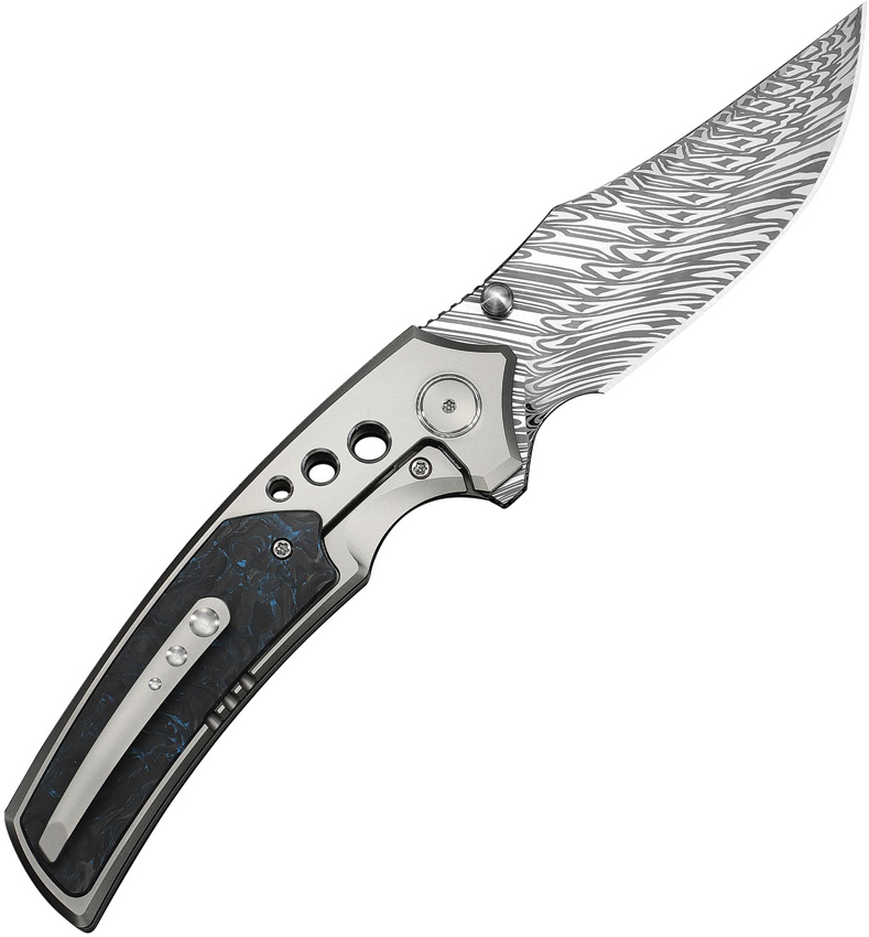 5″ (12.7cm) closed. 3.75″ (9.53cm) clip point blade. Gray titanium handle with Black and blue carbon fiber inlay. Extended tang. Thumb stud. Pocket clip. Fafnir Damasteel blade. Black nylon zippered storage case. Boxed.