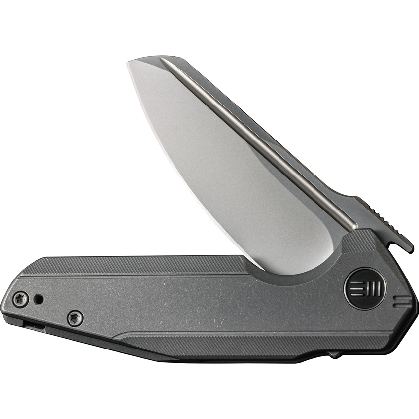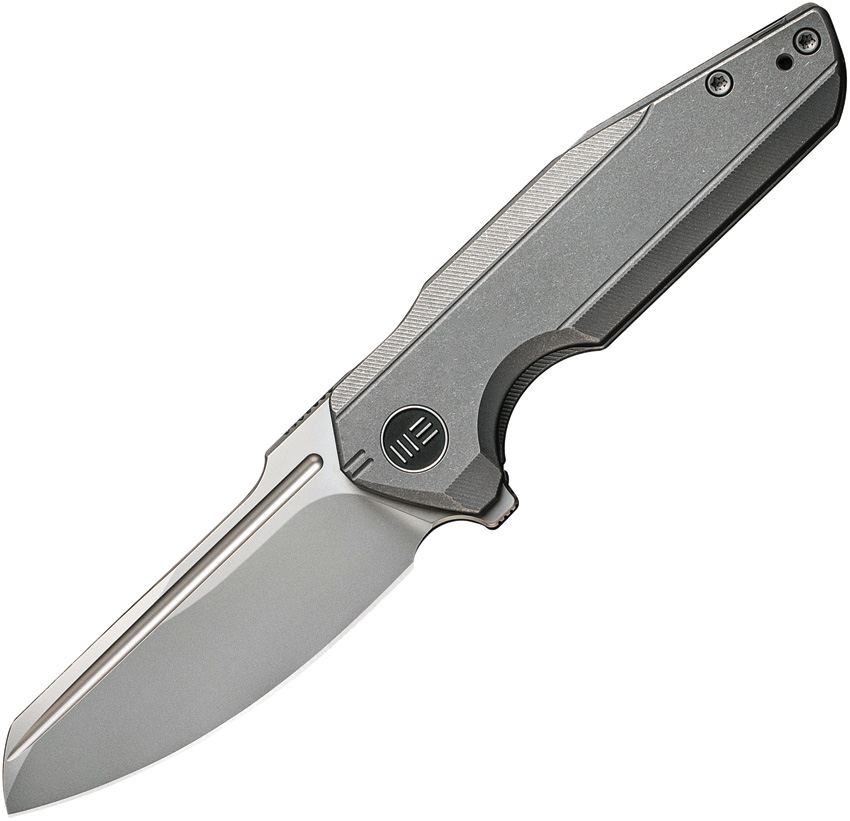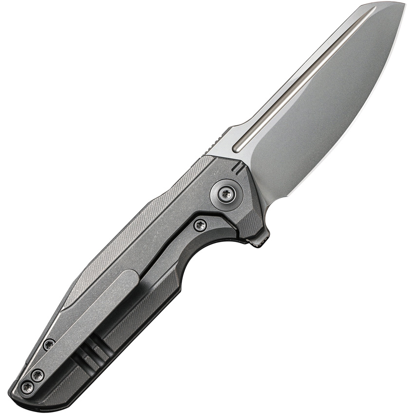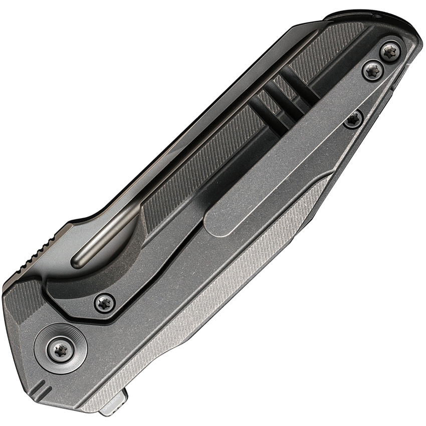 4″ (10.16cm) closed. 2.88″ (7.32cm) bead blast finish CPM-20CV stainless blade. Gray stonewash finish titanium handle. Extended tang. Pocket clip. Black nylon zippered storage case. Boxed.