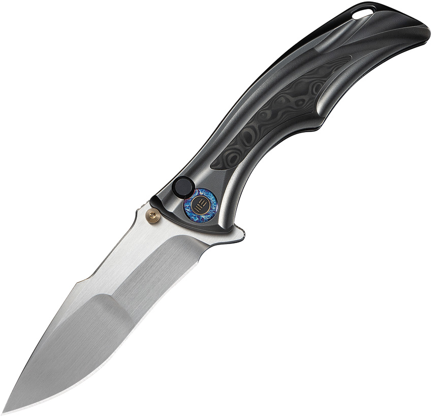 5.13″ (13.03cm) closed. 4″ (10.16cm) satin finish Bohler M390 stainless drop point blade. Black orange peel titanium handle with Rose pattern carbon fiber inlay. Extended tang. Pocket clip. Thumb stud. Lanyard hole. Black nylon zippered storage case. Boxed.