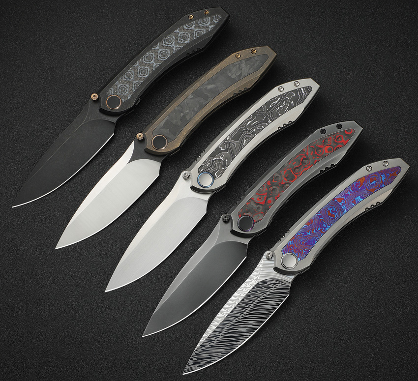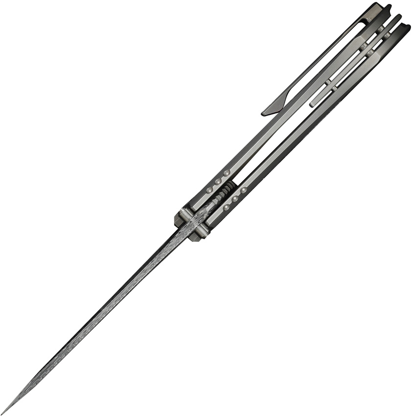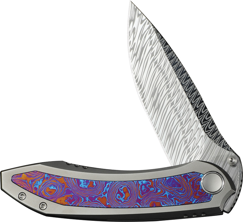 5″ (12.7cm) closed. 3.75″ (9.53cm) Damascus steel drop point blade. Bead blast finish titanium handle with Timascus inlay. Thumb stud. Pocket clip. Extended tang. Black nylon zippered storage case. Boxed.