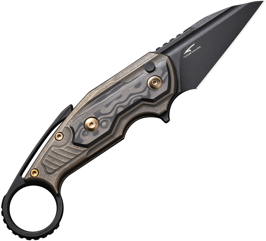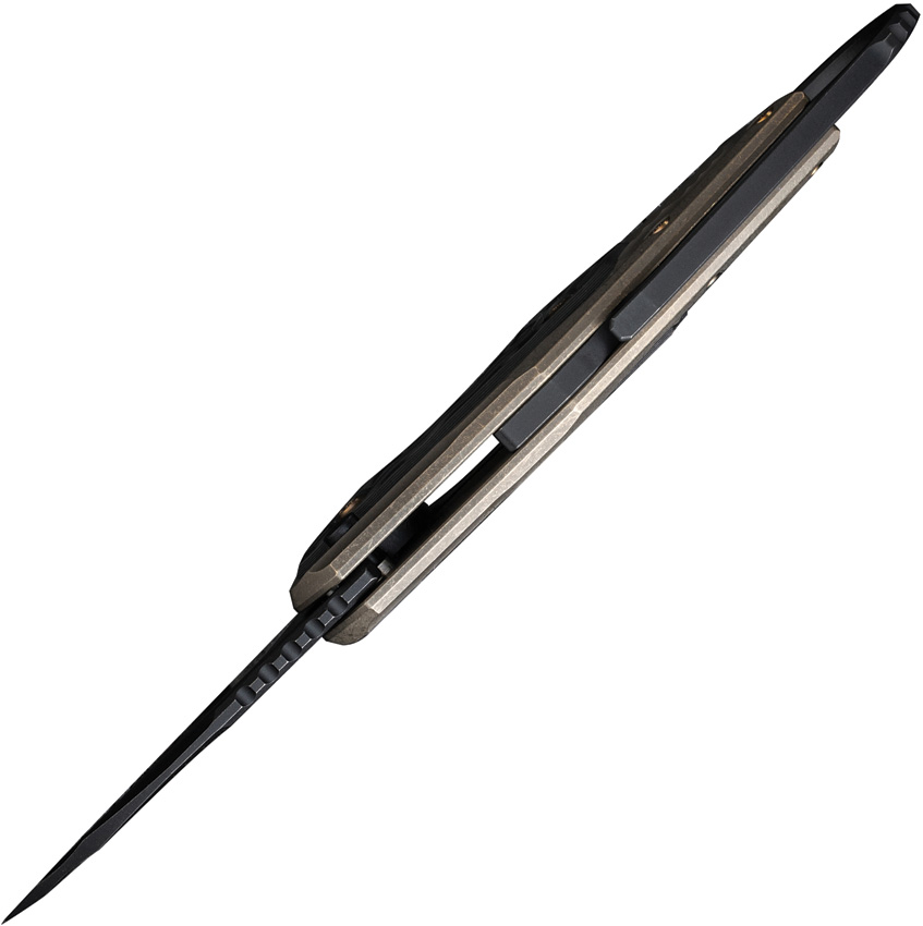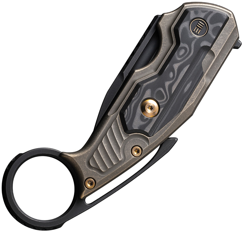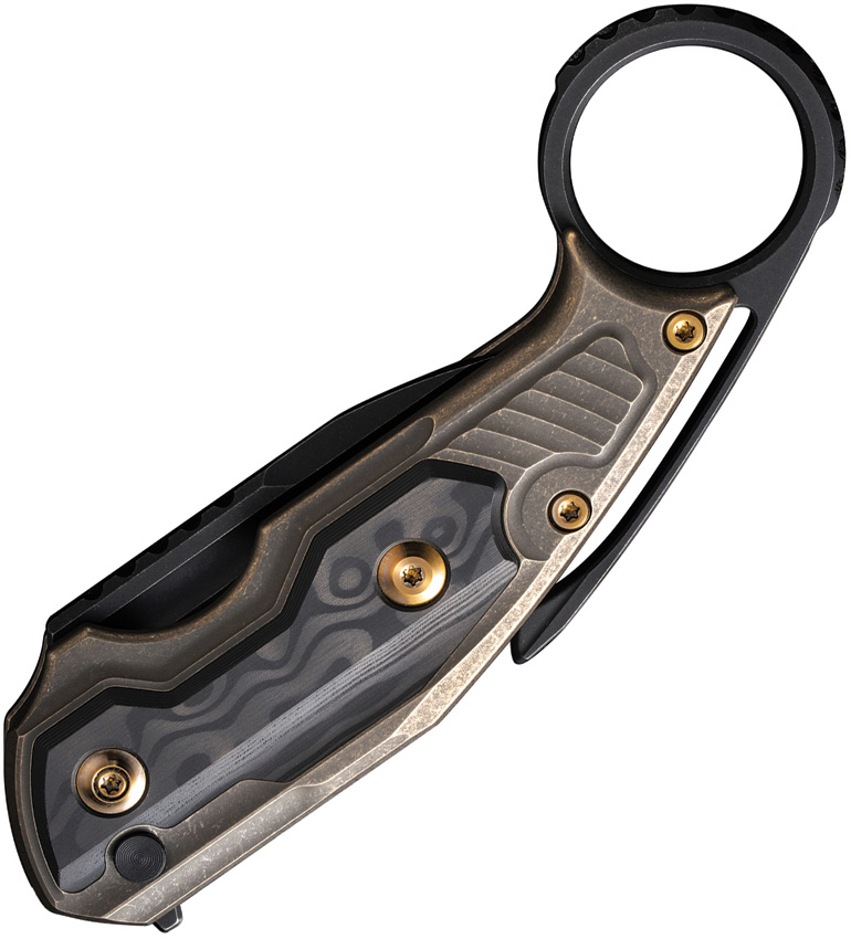 5.13″” (13.03cm) closed. 2.38″” (6.05cm) black stonewash finish CPM-20CV stainless blade. Bronze titanium handle with Rose carbon fiber inlay. Extended tang. Finger ring. Pocket clip. Black nylon zippered storage case. Boxed.