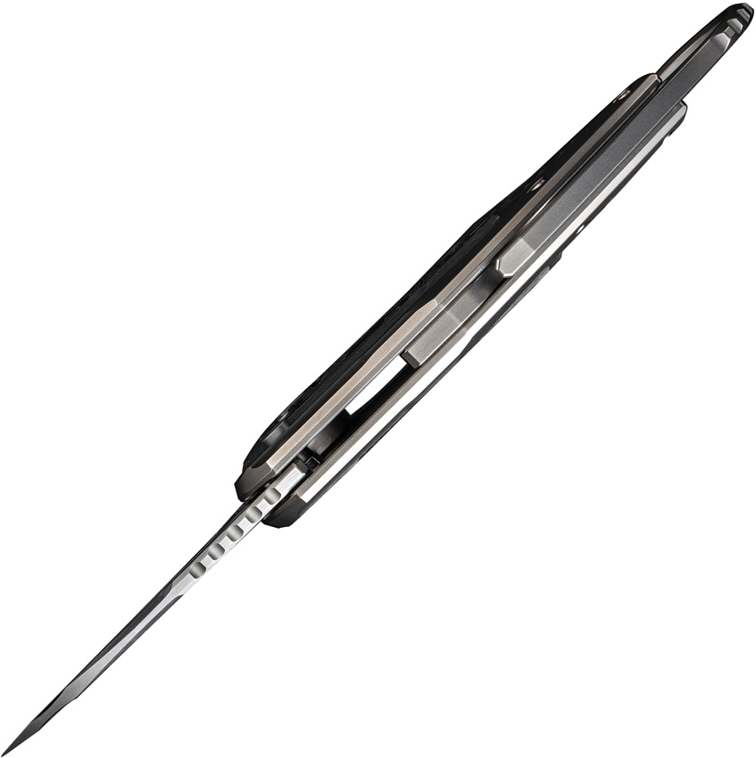 5.13″” (13.03cm) closed. 2.38″” (6.05cm) satin finish CPM-20CV stainless blade. Bead blast finish titanium handle with Aluminum foil carbon fiber inlay. Extended tang. Finger ring. Pocket clip. Black nylon zippered storage case. Boxed.