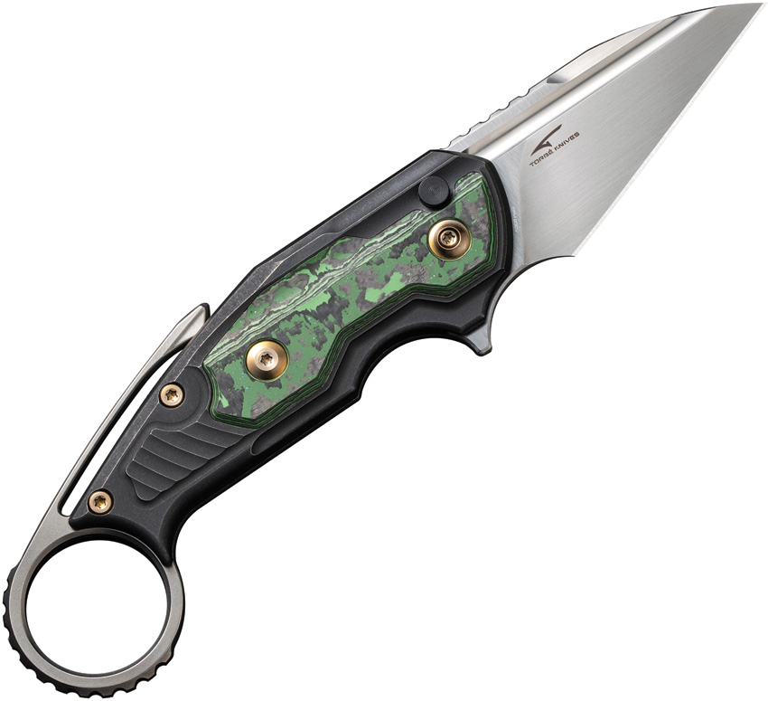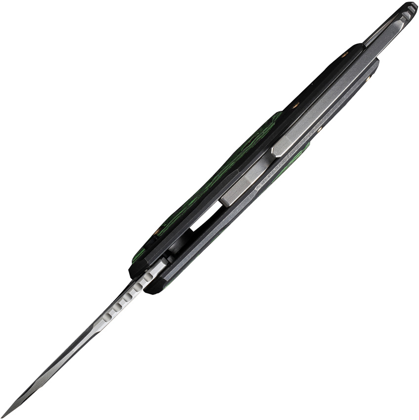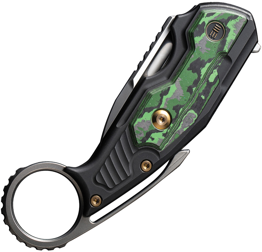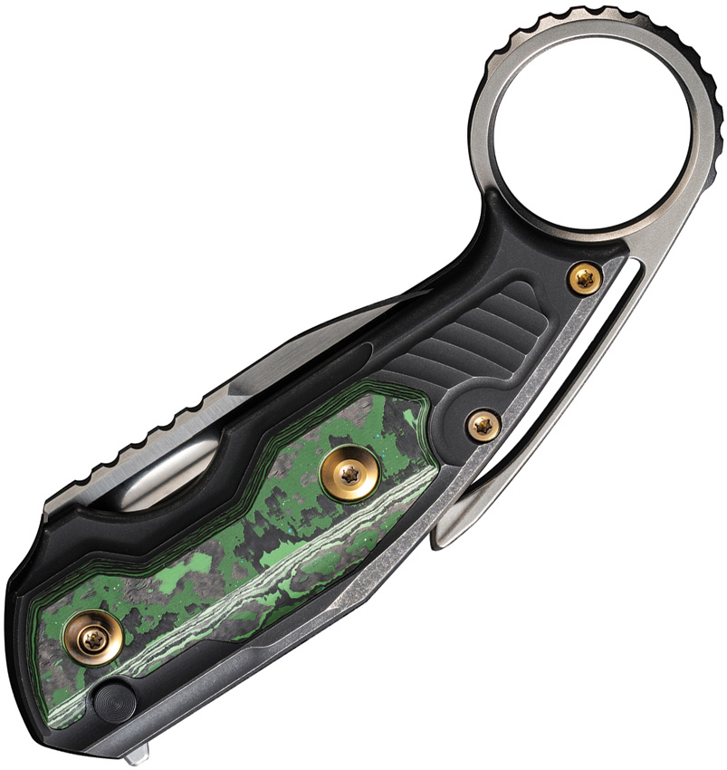 5.13″” (13.03cm) closed. 2.38″” (6.05cm) satin finish CPM-20CV stainless blade. Black titanium handle with Jungle Wear Fat carbon fiber inlay. Extended tang. Finger ring. Pocket clip. Black nylon zippered storage case. Boxed.