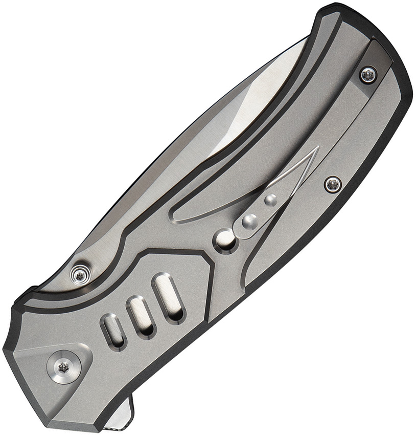 4.63″ (11.76cm) closed. 3.5″ (8.89cm) satin finish Bohler M390 stainless tanto blade. Gray titanium handle. Thumb stud. Extended tang. Pocket clip. Black nylon zippered storage case. Boxed.