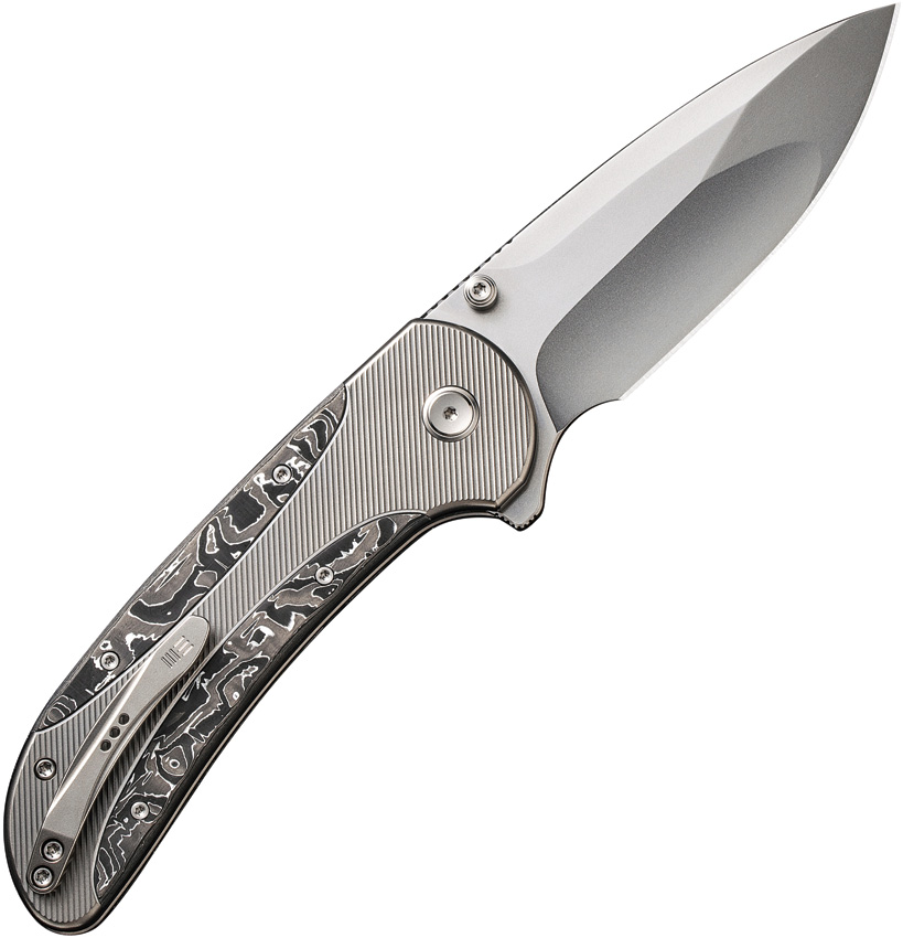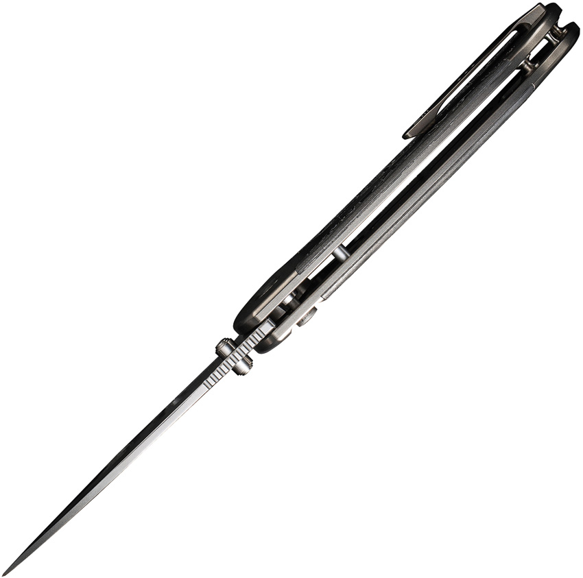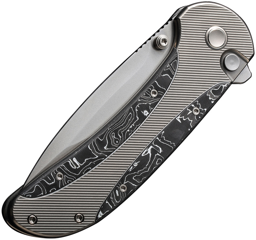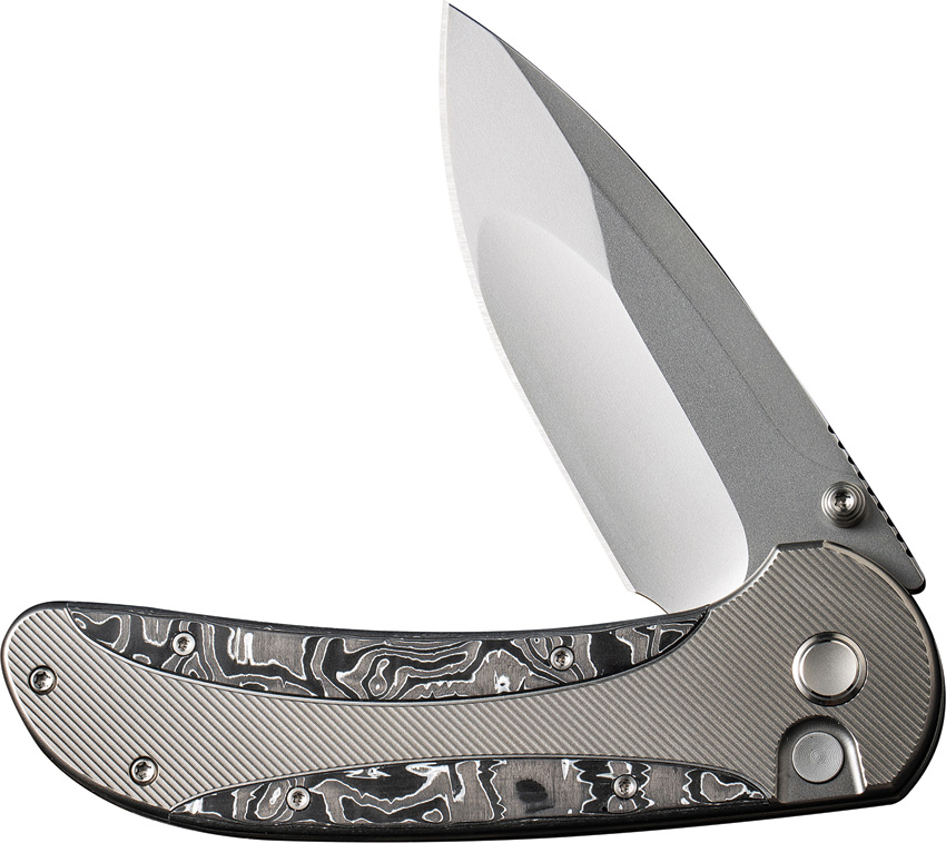5″ (12.7cm) closed. 3.88″ (9.86cm) bead blast finish CPM-20CV stainless drop point blade. Bead blast finish titanium handle with Aluminum foil carbon fiber inlay. Extended tang. Thumb stud. Pocket clip. Black nylon zippered storage case. Boxed.