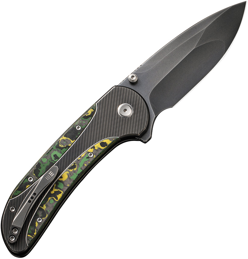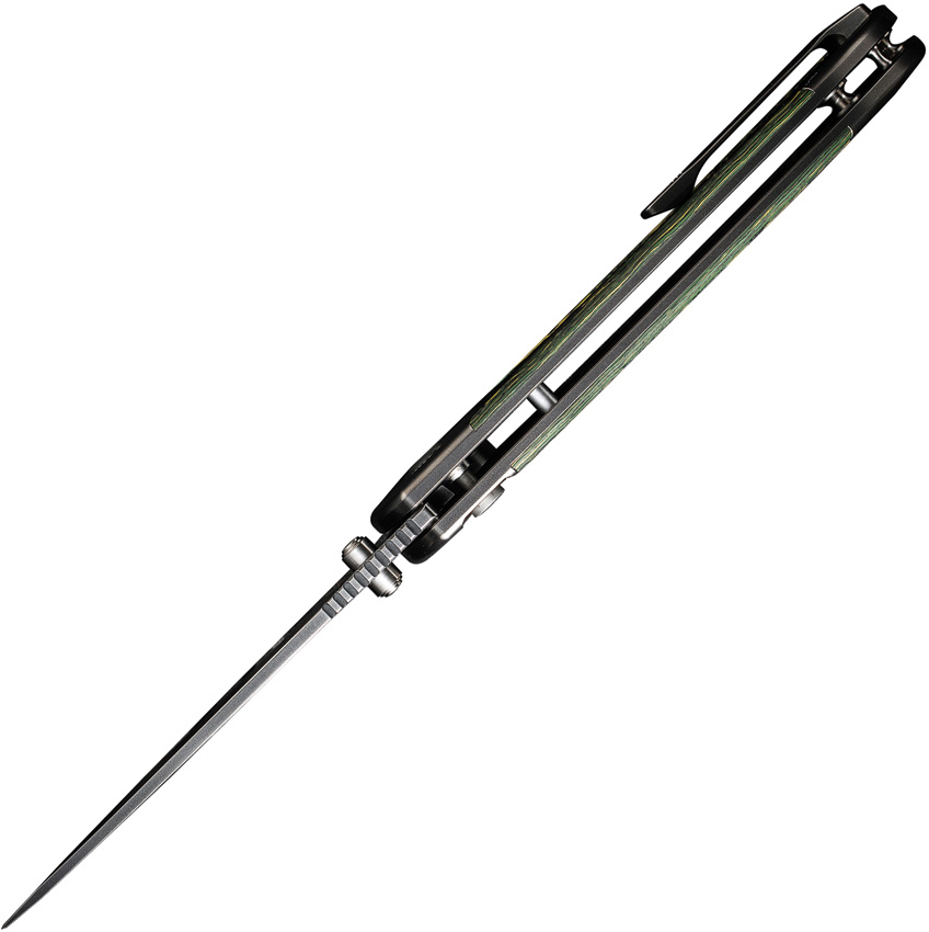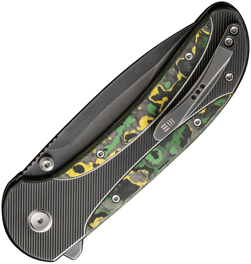 5″ (12.7cm) closed. 3.88″ (9.86cm) gray stonewash finish CPM-20CV stainless drop point blade. Gray titanium handle with Toxic Storm Fat carbon fiber inlay. Extended tang. Thumb stud. Pocket clip. Black nylon zippered storage case. Boxed.
