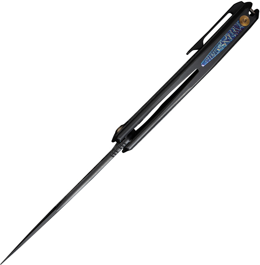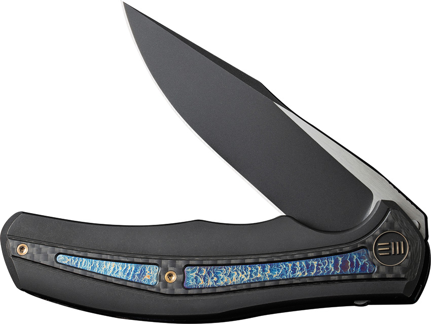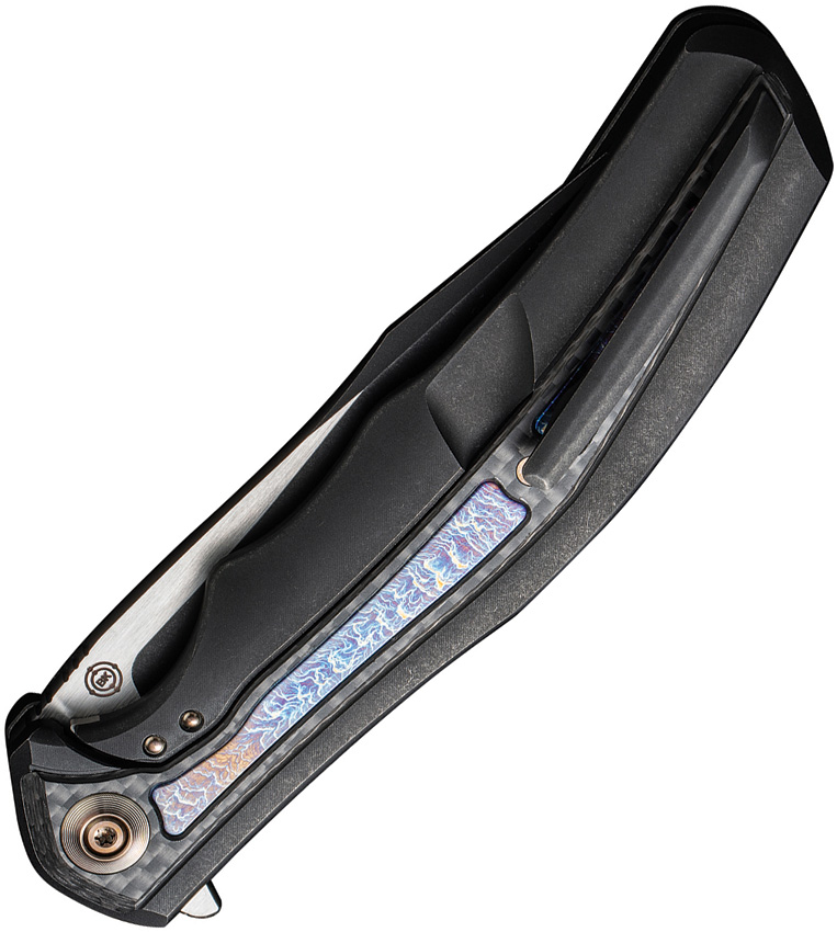 - Black stonewash finish titanium handle with twill carbon fiber and flame titanium inlay.