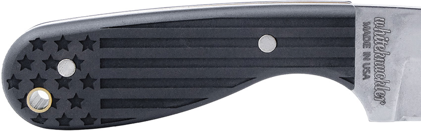 7.5″ (19.05cm) overall. 3.5″ (8.89cm) stonewash finish 154CM stainless blade. Black resin handle. Finger ring. Full tang. Lanyard hole. American flag sculpted handle. Black leather belt sheath. Boxed.