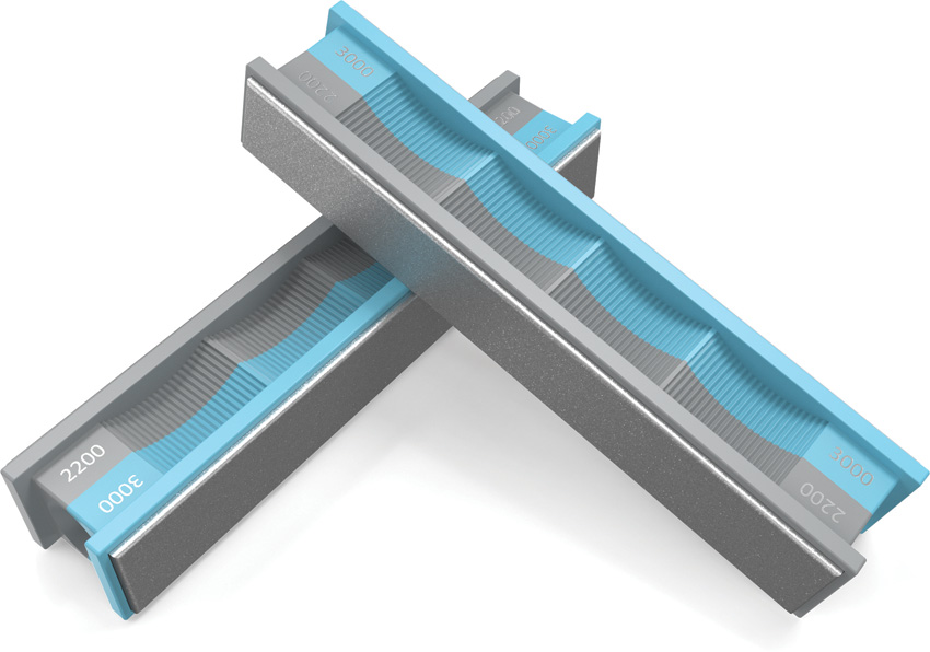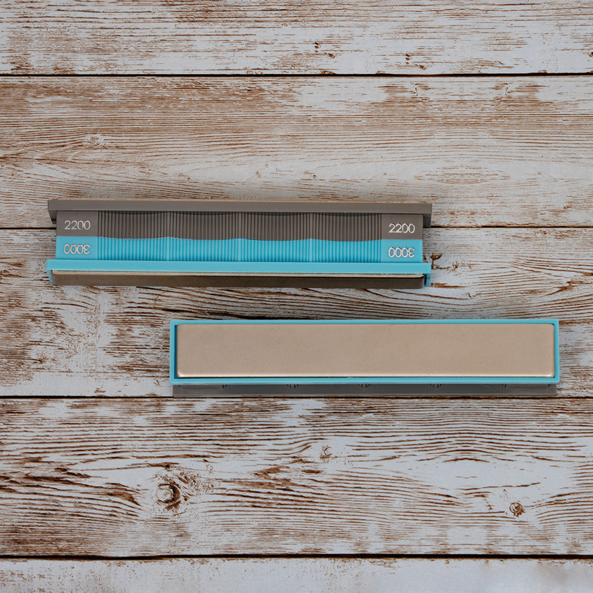 Two premium monocrystalline 2200 grit (gray) and 3000 grit (blue) diamond stones. Boxed.