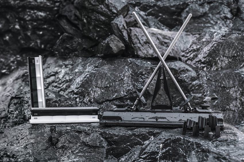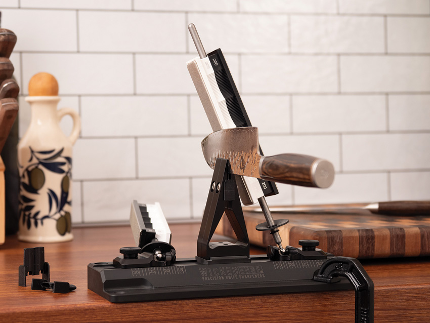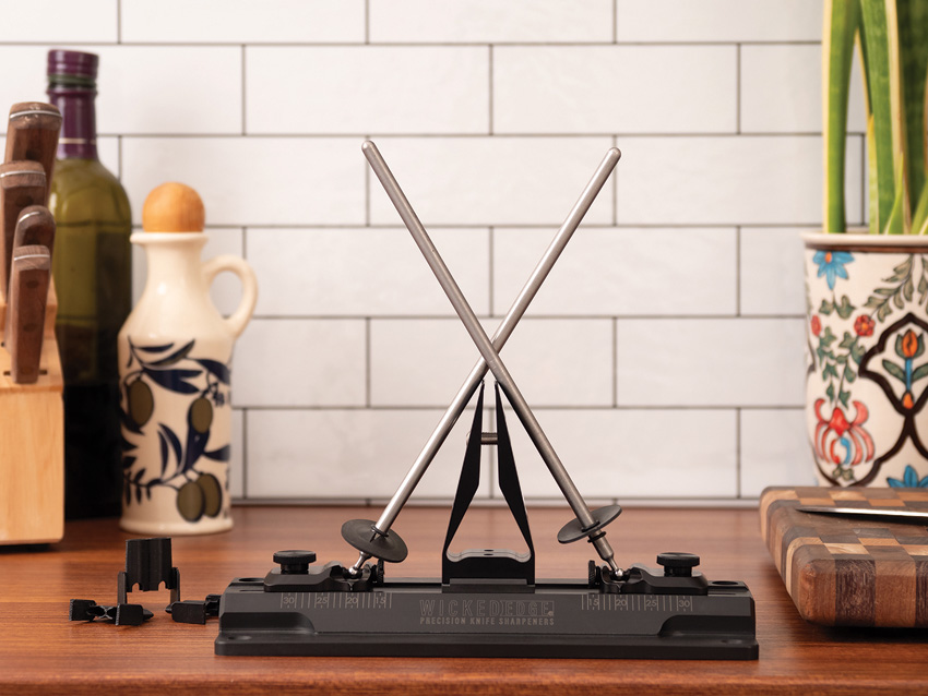 Includes: Standard 200/600 grit diamond stones (2 each); Injection molded GFN base; Type 2 anodized standard vise; 8.75″ stainless guide rods with shields; Alignment guide: Practice knife; Full YouTube instructional playlist. Able to sharpen blades up to 15″ long. Angle Range: 13-31 degrees per side (26-62 degrees inclusive). Angle Markings in 1-degree increments. Angle markings are calibrated for the knife’s edge to sit at 5/8″ above the top of the vise. Able to clamp blades up to 1/4″ thick. Compatible with: All Wicked Edge sharpening stones and strops; 13″ Guide Rods for WE60 Series Sharpeners; Low Angle & Small Knife Adapter; 60 Series Low Angle & Small Knife Kit; Scissor Attachment; Chisel Attachment; Aluminum Base. Boxed.