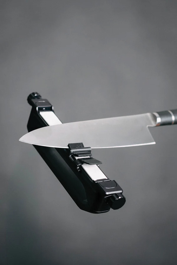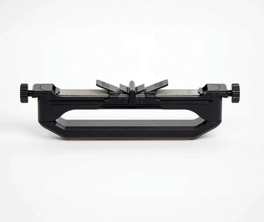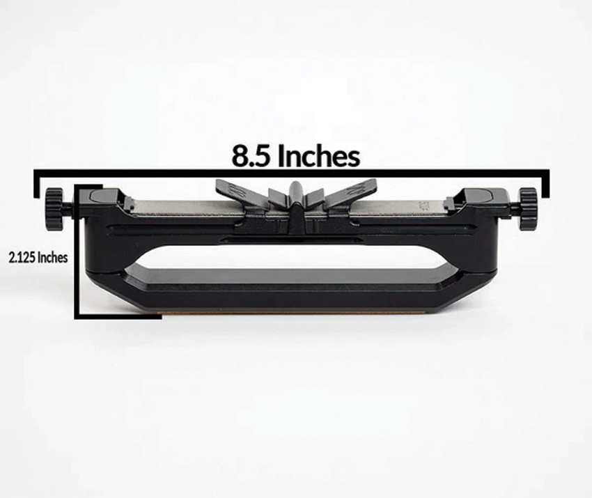 Dimensions: 8.5″ x 2.13″. Patent-pending angled knife guide ensures a consistent sharpening angle of 20 degrees every time. Dual-sided sharpening with a 500-grit diamond stone and ceramic hone. Rotating stone design for quick, easy grit changes. Constructed from precision milled, anodized aluminum. Lightweight and rugged, only 10 oz. Ergonomic handle. Leather strop. Knife guide stores safely in the handle for convenience on the go. Boxed.