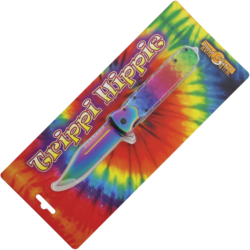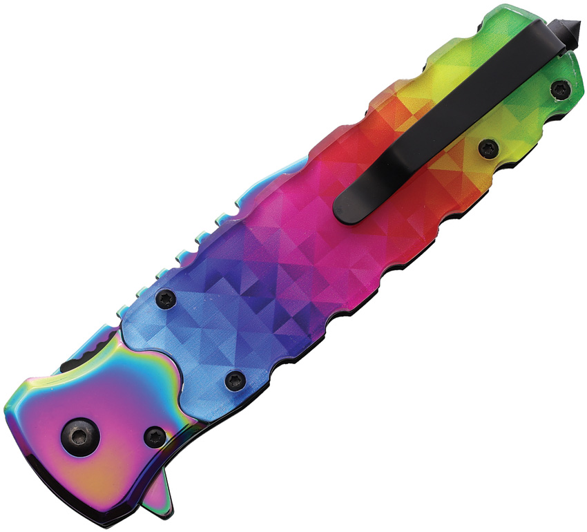 5.25″ (13.34cm) closed. 4″ (10.16cm) spectrum finish stainless clip point blade. Multi acrylic handle. Extended tang. Glass breaker. Pocket clip. Clam packed.
