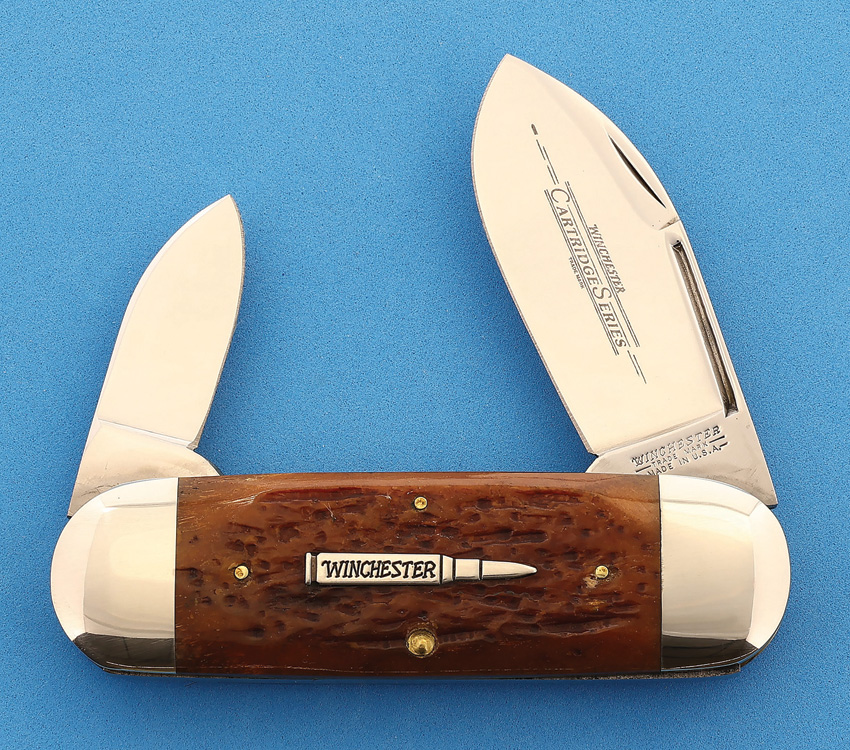 Winchester Cartridge Series Elephant Toenail. Model 18-29120. 4 1/16” closed 2 blade sunfish or elephant toenail pattern. Mirror polished spear point and pen blades. Master blade features double thumb pulls and Cartridge Series etch. Burnt orange jigged bone handles with cartridge shell inlay. Nickel silver bolsters. Produced in 1998 by Queen Cutlery in Titusville, PA. Colorful cardboard gift box with velour insert.