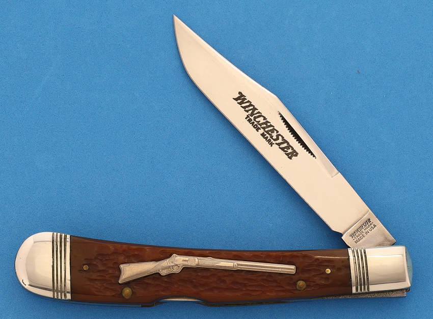 Winchester Lockback Toadsticker. Model 19-107 ½. 5 5/16” closed. Mirror polished clip point blade etched Winchester Trade Mark. Burnt orange jigged bone handles with grooved nickel silver bolsters and rifle inlay shield. Produced in Titusville, PA by Queen Cutlery in 1994. Blade may have a couple of tiny rust specks. Original cardboard gift box is a little stained.