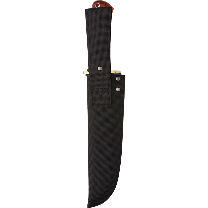 14″ (35.56cm) overall. 8.75″ (22.23cm) satin finish stainless bowie blade. Brown wood handle. Brass guard. Lanyard hole. Black nylon belt sheath. Clam packed.