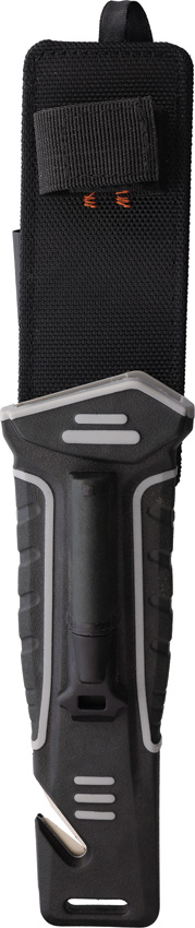 9.5″ (24.13cm) overall. 4.88″ (12.4cm) gray titanium coated D2 tool steel blade. Lanyard hole. Black PP and TPR twice injected handle. Sheath includes fire starter and sharpener. Black polymer belt sheath. Boxed.