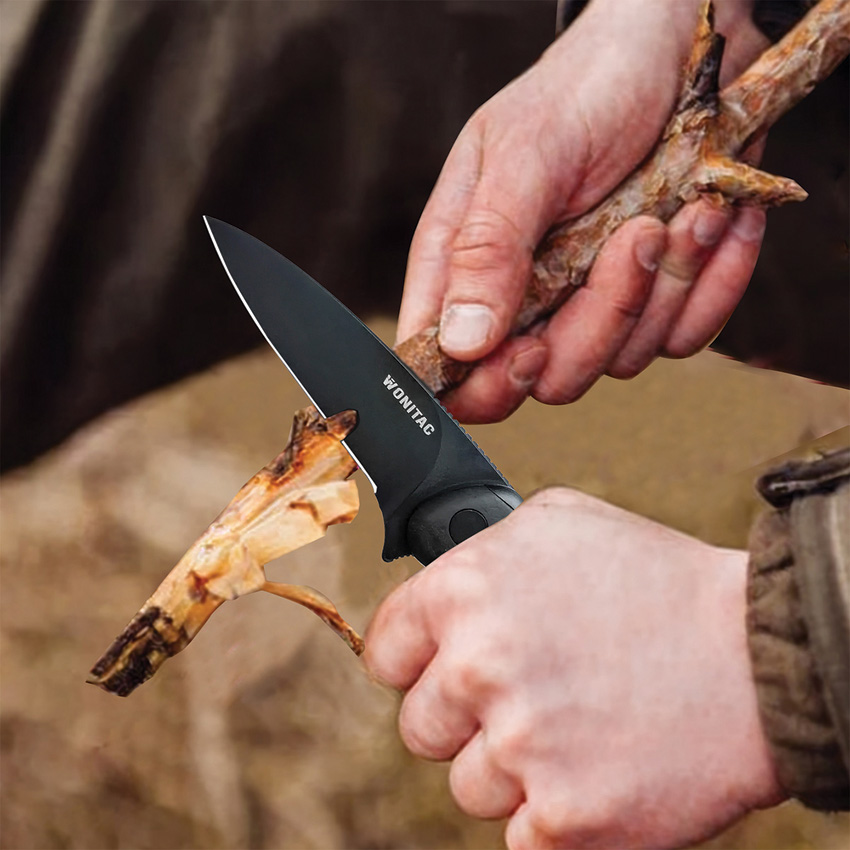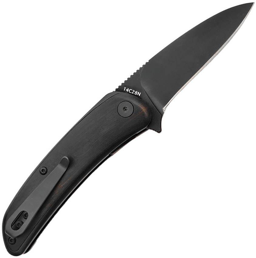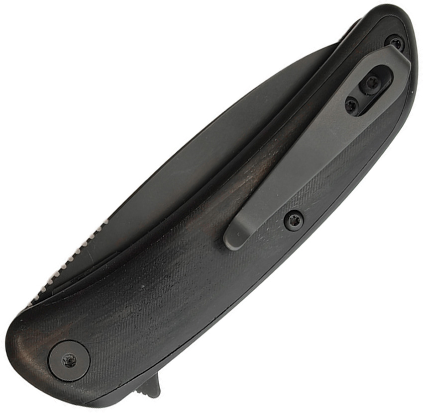 4.13″ (10.49cm) closed. 3″ (7.62cm) black finish 14C28N Sandvik stainless sheepsfoot blade. Ebony wood handle. Extended tang. Pocket clip. Boxed.