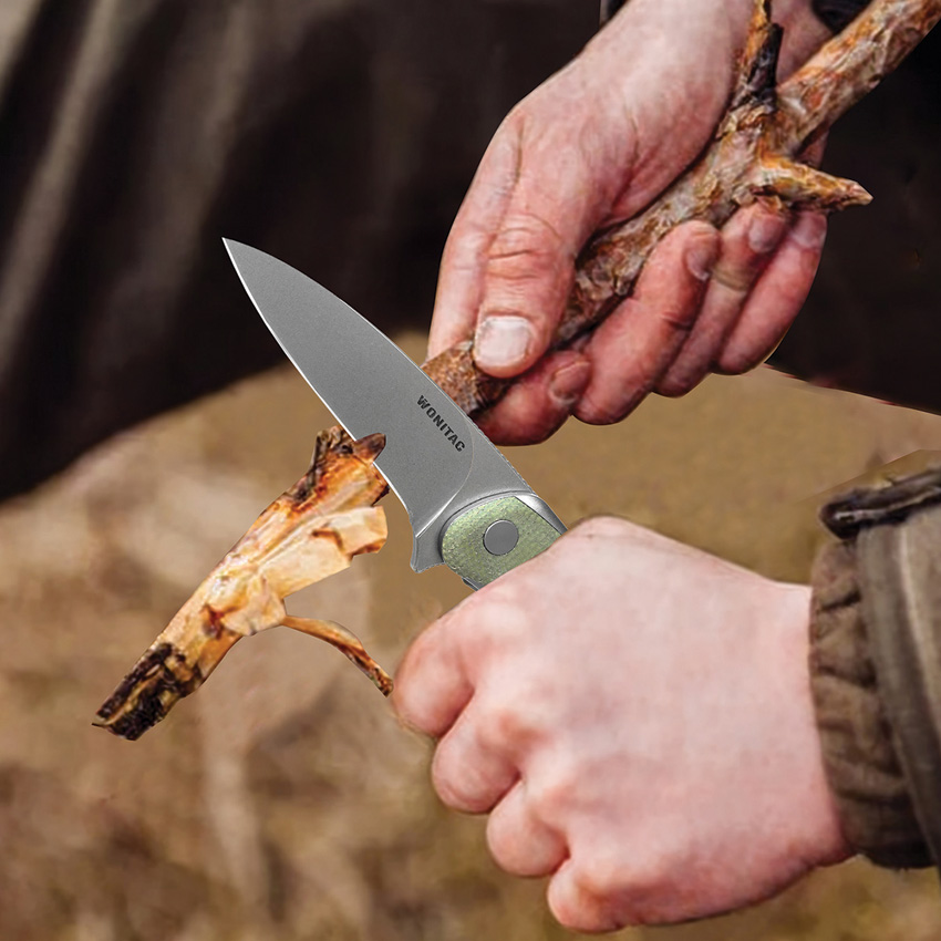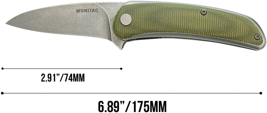 4.13″ (10.49cm) closed. 3″ (7.62cm) stonewash finish 14C28N Sandvik stainless sheepsfoot blade. Green canvas micarta handle. Extended tang. Pocket clip. Boxed.