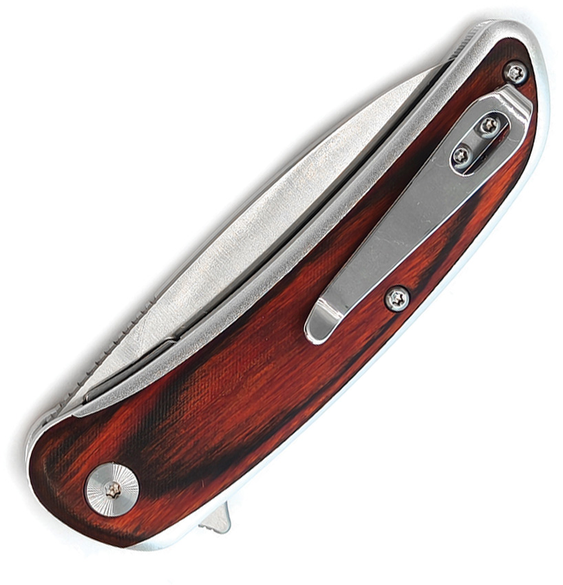 4.13″ (10.49cm) closed. 3″ (7.62cm) satin finish 14C28N Sandvik stainless sheepsfoot blade. Red Sandalwood handle. Extended tang. Pocket clip. Boxed.