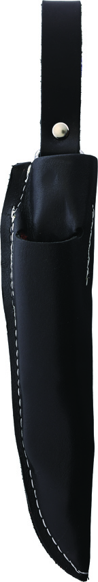 Carbon steel blade. Includes: 8″ overall with 3.63″ blade; 7.5″ overall with 3.5″ blade with sharpened top edge. Black plywood handle. Black leather belt sheath. Bulk packed.