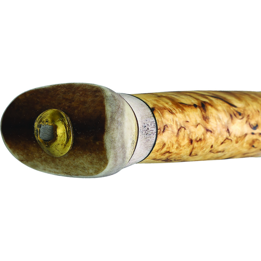 6.75″ (17.15cm) overall. 2.25″ (5.72cm) carbon steel blade. Curly Birch handle. Reindeer horn pommel. Horn spacers. Due to the natural materials used, knife dimensions could vary. Brown leather belt sheath. Bulk packed.