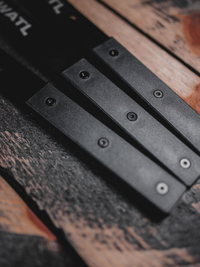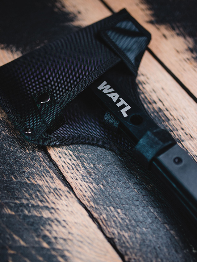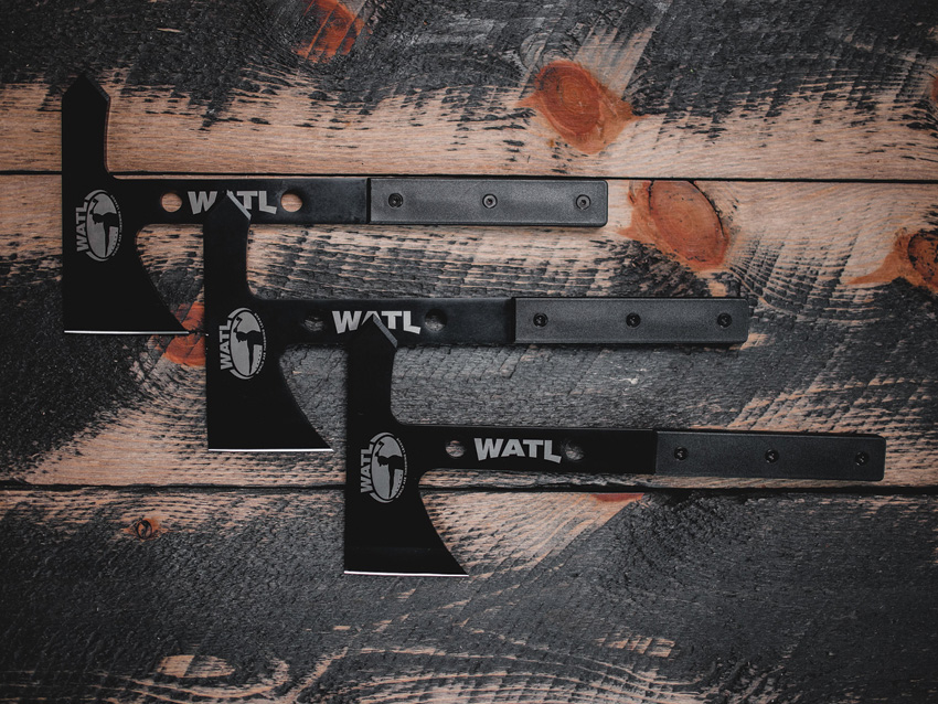 12.5″ overall. 6″ black finish stainless axe head with 3″ cutting edge. Tail spike. Straight handle grip with low profile. Removable handles. Currently not allowed in WATL Axe Leagues. Black nylon belt sheath. Boxed.