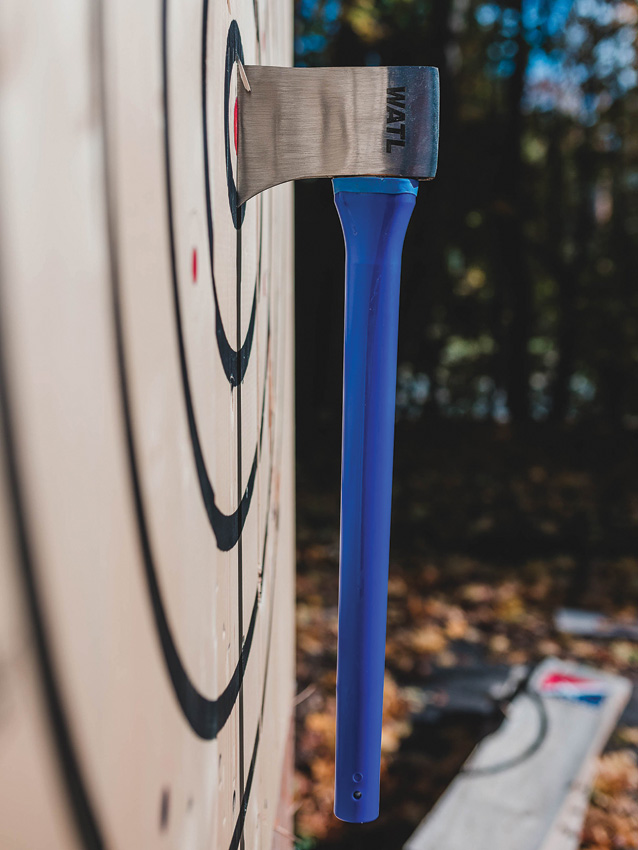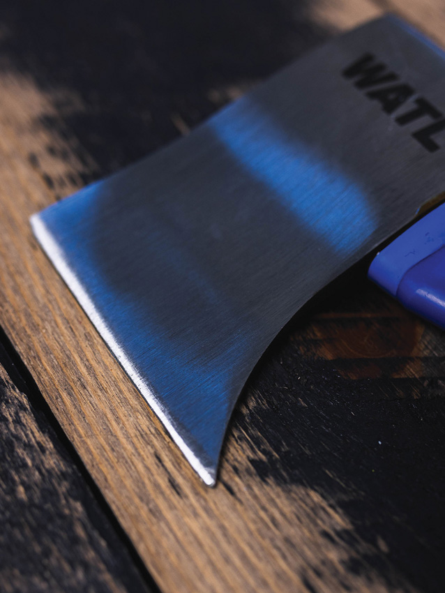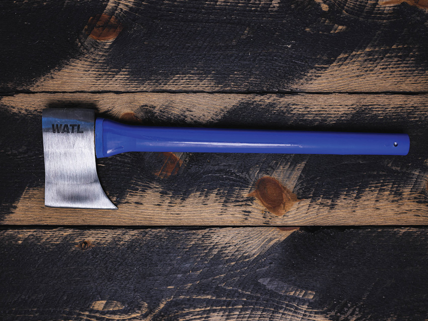 19.25″ overall. 4″ 1045 carbon steel axe head with 3.25″ cutting edge. Blue fiberglass handle. Lanyard hole. Weight: 2.52lb. 19″ handle. 1.65 lb head weight. Black nylon belt sheath. Boxed.