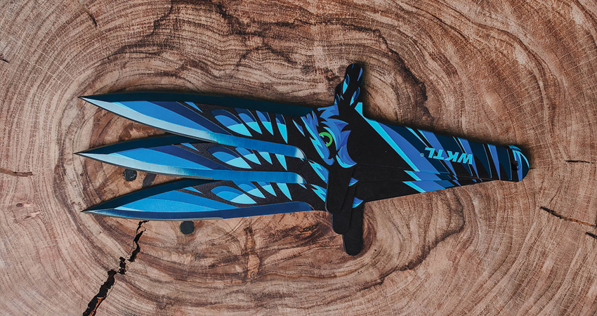 14.25″ (36.2cm) overall. 7″ (17.78cm) 3Cr13 stainless blade. Weight: 1.2lb. Set of three. Sorcerer’s Fury artwork. An extended dual bladed knife allows for full coverage over a full inch down the blade. WKTL blade guards are formulated to protect these throwers from bounces and knives flying through protective fencing while still allowing for the highest precision. Boxed.