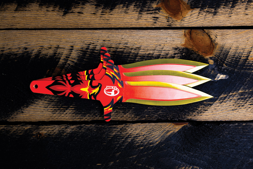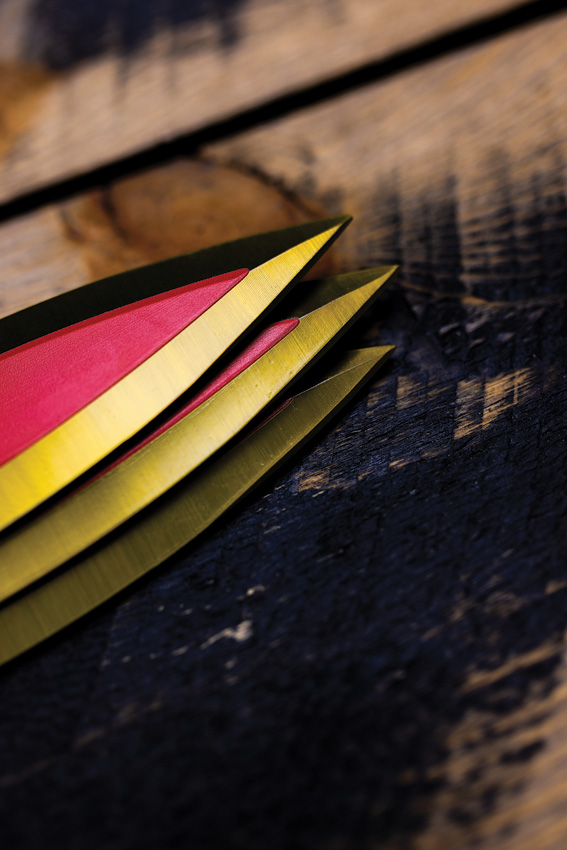 14.25″ (36.2cm) overall. 7.5″ (19.05cm) 3Cr13 stainless blade. Lanyard hole. Weight: 1.3lb. Set of three. Inferno finish. Blade guards are formulated to protect throwers from bounces and knives flying through protective fencing while still allowing for the highest precision. Extended dual bladed knife allows for full coverage over a full inch down the blade. Boxed.
